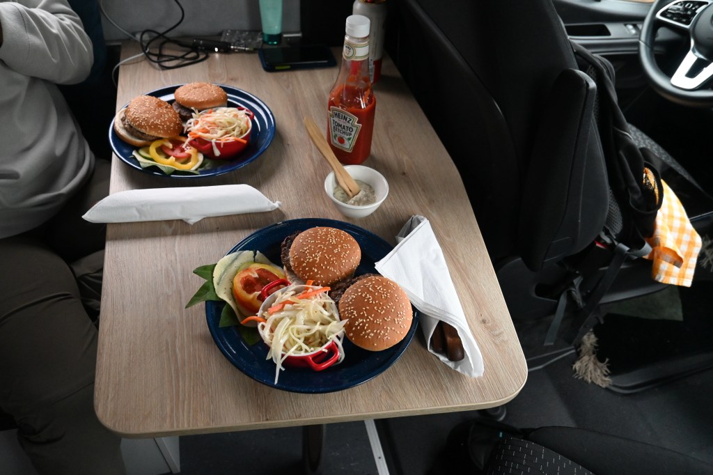 Von Anfang an war klar, dass wir hier nicht kochen wollten. Statt dessen gab es eine Camper Vollpension. Zwar war die Saison für Elch- und Rentierburger schon vorbei, aber auch der normale Burger war nett. Auf Bärenburger hatten wir beide keine Lust.
